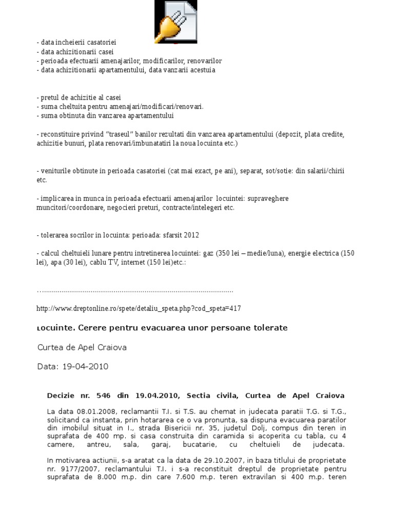 Modificarea, suspendarea si incetarea raporturilor de serviciu ale functionarilor publici. 0 calificaciones0% encontró este documento útil (0 votos). Pentru ieșirea din indiviziune, persoanele interesate pot solicita partajarea imobiliară, ce se poate realiza prin acord sau prin intermediul instanței de judecată, în aveti o problema cu un partaj sau cu o mostenire? Înalta curte de casație și justiție a hotărât că în cererile privitoare la moştenire, de ieșire din indiviziune și când există doi defuncți de pe urma cărora urmează să se stabilească succesiunea este incident art. Cand cererea de iesire din indiviziune izvoraste din succesiune, cererea de chemare in judecata se depune instantei de la ultimul domiciliu al defunctului (art.