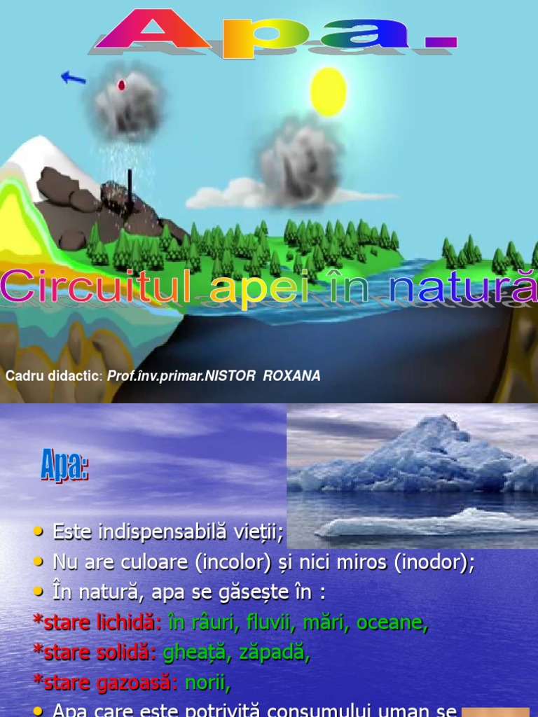 vizitati articolul complet aici : https://www.slideshare.net/danacretu/apa-sitransformarileei Vaporii de apa sunt in stare gazoasa si nu lichida. Astfel, presiunea aerului va fi data de suma dintre presiunile partiale ale componentilor lui, n2 si o2 si presiunea partiala a vaporilor de apa. Fenomenul care trece din stare lichida in stare gazoasa a apei se numeste evaporare si in stare solida solidificare si din stare gazoasa in.
